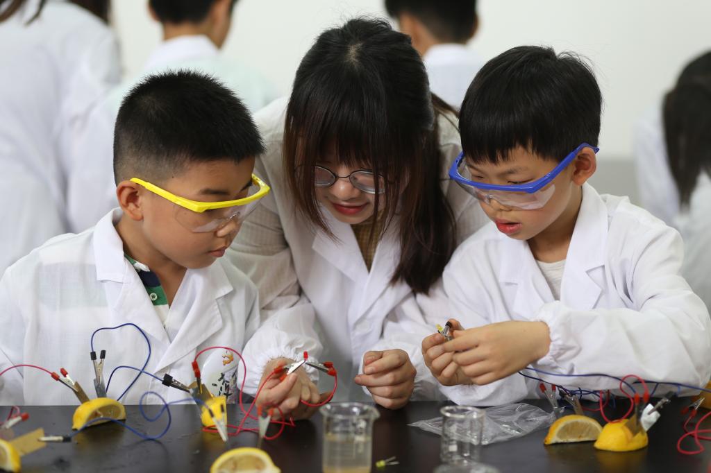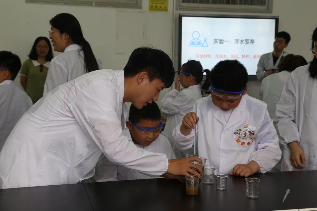 党委委员冯高峰博士的趣味指导下,孩子们在化学创新实验室开展了污水净化、水果电池两个趣味实验。生活中看似神奇的净水,通过亲手“调配”“混搭”,生动地展现在孩子们眼前。飘着清香的柠檬,把孩子们馋得直流口水,但当这些柠檬里插入铜片、锌片,连接导线和LED灯,又会发生怎样的变化?一个个趣味实验,深深地吸引着好奇的孩子们,他们时而专注,时而气馁,时而惊叹,时而欢呼。神奇而有趣的实验,在日本av在线