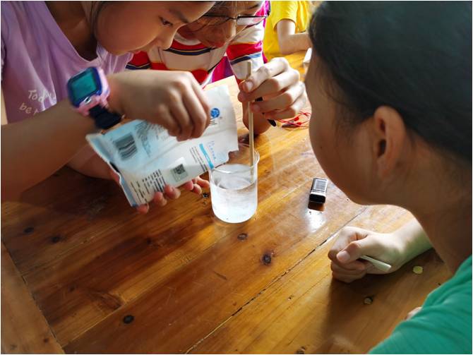 第二个实验由å°ç»„æˆå‘˜é˜®ä½³é‘«ä¸»è®²ï¼Œå…¶ä»–䏉使ˆå‘˜è¿›è¡Œé…åˆã€‚剿®µæ—¶é—´ï¼Œæ–°å† ç–«æƒ…肆è™ï¼�84消毒液çªç„¶æˆä¸ºâ€œæŠ¢æ‰‹è´§â€ï¼Œè¿™æ¬¡æˆ‘们就å«å¤§å®¶å¦‚何制作在家就能完æˆçš„简æ˜�84消毒液。å°é˜®è€å¸ˆå…ˆæ¼”ç¤ºåˆ¶ä½œè¿‡ç¨‹ï¼Œå°æœ‹å‹ä»¬åˆ†ç»„在我们的帮助下亲自动手制作,并æé†’åŒå­¦ä»¬æ³¨æ„观察实验中的现象,æ€è€ƒã€çŒœæµ‹åŽŸå› ï¼Œæœ€åŽç”±å°é˜®è€å¸ˆè¿›è¡Œè§£ç­”ã€�