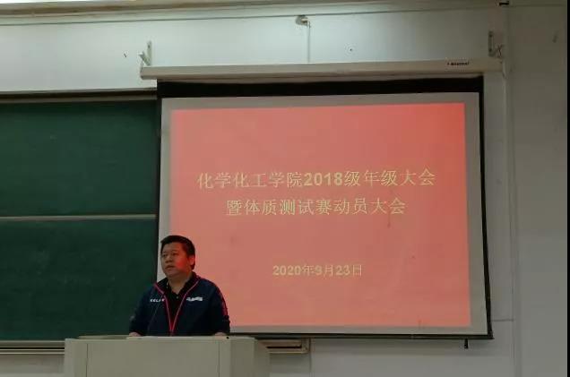 2020�9�23日下�16:00,我院在理工�134教室召开�2018级年级大会暨体质测试赛动员大会。学院党委副书记徐青老师、学生科科长章江燕老师、学生科副科长韩超峰老师以及2018级全体学生参加动员会,会议由章老师主持�