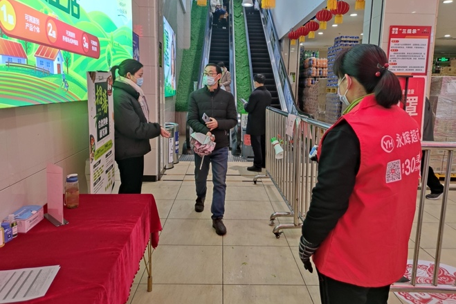 王菲负责在永辉超市入口提醒市民要佩戴好口罩并出示健康码,测量体温�